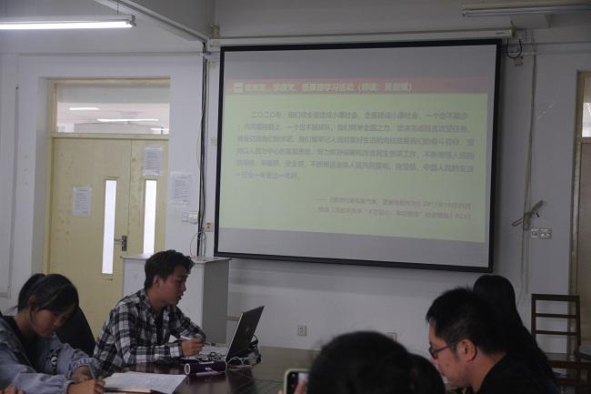 会上,学院党总支副书记、副院长陈真向全体与会成员介绍了本次“不忘初心、牢记使命”主题教育活动内容,领读了《习近平关于“不忘初心、牢记使命”论述摘编》中关于中国共产党人初心与使命的论述片段,以及《习近平总书记关于青年学生成才和教师思想政治工作重要论述摘编》中关于教师责任使命的工作要求。随后,学院党支部宣传委员李翔、辅导员张军丽、学院学生会副主席吴剑斌,少数民族学生代表迪力夏提、专业导生蔡儒俊四人分别从《习近平关于“不忘初心、牢记使命”论述摘编》、《习近平总书记系列重要讲话读本》以及《习近平总书记关于青年学生成长成才和教师思想政治工作重要论述摘编》中选取了有关理想信念、民族团结、青年使命和奋斗精神等重要内容带领全体与会成员一同学习了原著原文,并结合自己实际情况做了交流分享。
