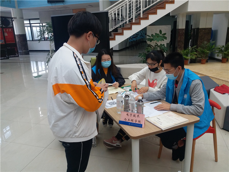 2020年11月11日,菲律宾亚星yaxing国际在图书馆大厅迎接汽车电子专业22名扩招学生。党总支副书记、副院长陈真,扩展班辅导员秦婧,以及5名专业导生和2名志愿者参与了迎新工作。